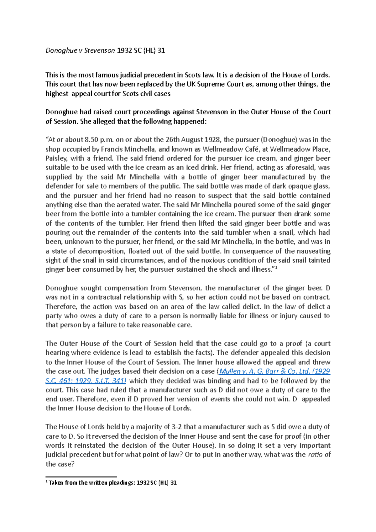 Donoghue V Stevenson Summary Reading A Case How Do Judges Use Precedent Donoghue V Stevenson Studocu