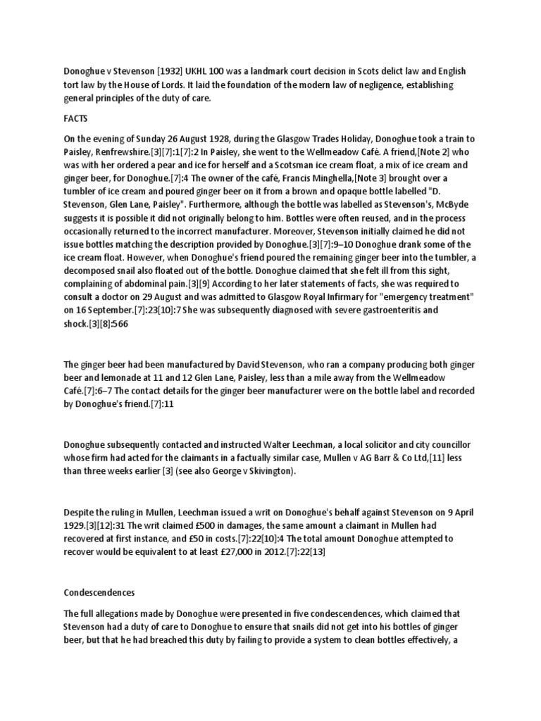 Fact summary Issues and Judgment of Court In Donoghue v Stevenson 1932 UKHL 100. Donoghue a Scottish dispute is a famous case in English law which was instrumental in shaping the law of tort and the doctrine of negligence in particular. The Singular Case of Donoghue v Stevenson Law Report Annual Lecture 07 July 2010 accessed 07 July 2015.